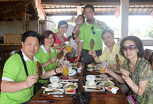 烏布皇宮是烏布王朝在16世紀(jì)所建造的皇宮,遺址內(nèi)雖已無(wú)國(guó)王居住,但據(jù)說(shuō)還有其皇族后裔深居其中,皇宮外觀雄偉的石刻技術(shù)堪稱一絕,內(nèi)部裝潢更是金碧輝煌令人贊嘆不已。在烏布,手工作坊和賣藝術(shù)品的小店隨處可見(jiàn),但來(lái)烏布最不能錯(cuò)過(guò)的還是烏布傳統(tǒng)市場(chǎng),這幾乎是每一位巴厘島觀光客旅行中不可錯(cuò)過(guò)的旅游地點(diǎn),綠之韻精英們?cè)缇湍θ琳?、躍躍欲試,蜂擁而上選購(gòu)自己心儀的手工藝品和商品。烏布傳統(tǒng)市場(chǎng)位于烏布市中心,烏布皇宮正對(duì)面,除了一排灰白的兩層式建筑,周圍的三條路上還聚集了各式的商店,這里是烏布的精華區(qū),人多嘈雜,各式貨品都有,例如銀器、木雕、編織、各式蔬果、衣服、沙龍、皮件、鞋子及紀(jì)念品、樂(lè)器等等。午餐時(shí),綠之韻精英們大飽口福,享用了印度尼西亞獨(dú)特的臟鴨餐,巴厘島的特色美食臟鴨餐是赫赫有名的特色餐品。當(dāng)?shù)鼐用癜养喿由B(yǎng)在稻田中,非常的生態(tài),由于鴨子靠吃食稻田里的小蟲(chóng)為生,當(dāng)?shù)厝朔Q臟鴨。鴨肉鮮美,富有彈性,極少的脂肪,在當(dāng)?shù)靥赜械呐腼兗庸ず?,粘上特制醬料,大家紛紛感嘆美味夠勁道,真是聞名不如品嘗。